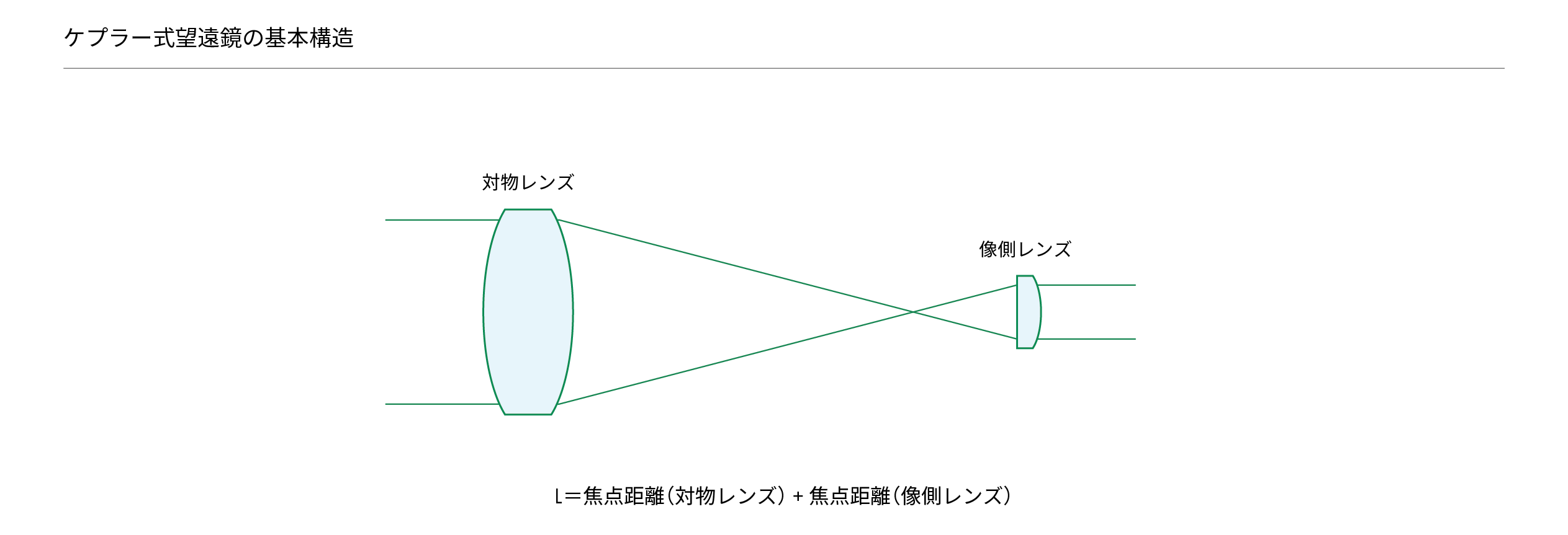 ケプラー式は、凸レンズを2枚使い、それぞれのレンズの焦点距離の和だけ離してレンズを配置しています。